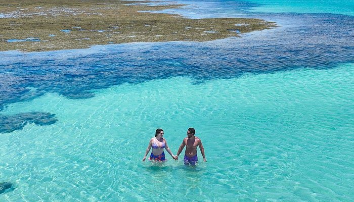 🌴 Coqueirais lindos e exuberantes que dançam ao sabor do vento. 🏖️ Uma areia fina e branquinha que parece talco sob seus pés. 🐠 Piscinas naturais de águas mornas e transparentes, revelando recifes de corais vibrantes e uma vida marinha exuberante.